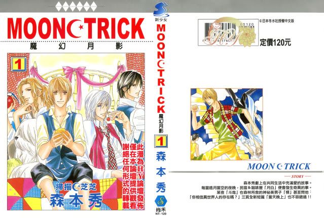 森本老師故事的另一特色就是, 角色多。從仁獸到GD到天使再到這本, 雖然MOON TRICK第一集裡角色還不多, 但已經可以預知當斗哉他們踏上旅行後會遇見多少的人物。我個人其實蠻討厭角色很多的故事.... 一為難記二為角色一多就很能帶有自我特色。但遇到森本老師後, 就連角色出名的多的GD我都可以心平氣和的記住每個人且每位都喜歡。MOON TRICK第一集其實只是做為契子而已, 除了斗哉大雅及楪外, 其他人的出場還不算是很多。就目前為止, 我對大雅的興趣其實多過楪(笑) 大雅真的是好可愛啊!!!! 他觔斗哉兩人感覺真是兩小無猜(笑) 而這次的另一男角: 楪, 與其說像是GD中的岩瀨不如說是像天使中的男角。難得老師男(攻)的氣勢可以完全壓過男(受)。話雖如此MOON TRICK應該跟天使一樣只是打曖昧的擦邊球啦.... 畢竟老師一開始就說了這是本"友情"作(笑) 其中有位我倒是蠻驚訝他會成為主配角之一的, 那就是敗在斗哉之下的男保鑣。雖然連名字都尚未出現, 但既然已經搬到蓮的咖啡廳內應該代表他算主配之一吧.... 雖然他身上完全沒有主配的感覺在(笑)