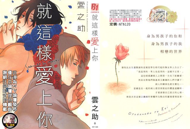 雲之助老師剛好這兩個月內連續出了不少書, 連續看下來多少可以對老師大致的調調有點初略的瞭解。老師的故事誠如其名, 就像雲朵般輕柔柔又軟綿綿的。沒什麼大起大落, 說的都是一對又一對這城市中兩個人之間的戀愛。沒有黑道或異國風味等特殊背景, 就只是單純的戀愛。這麼聽起來似乎有點乏味, 畢竟每本BL漫都是講主角們的戀愛, 所以不靠些背景或設定來提陳的話容易落為俗套的故事。但云之助老師雖然說的都是戀愛故事, 但每本中的角色們個性都不太同, 而且總讓我看完便想提筆寫寫他們間的故事。或許有人會覺得老師筆下的角色們過於女性化, 的確...在充滿男人味的BL漫中老師的角色們總顯示那麼點天真又那麼點不真實, 不過看下來卻不致於有平胸受或是小白漫的感覺, 相反的則是總忍不住替他們的愛情微笑起來。這兩個月剛好是我考試及生活忙到極點的一段日子, 雲之助老師作品不需要特別動腦或提心膽跳擔心下一秒會發生什麼事, 這種小品式的溫馨生活漫總讓我感到很放鬆。