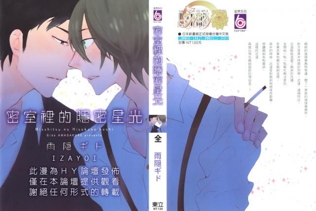 從雨隱老師第一本書開始便好喜歡她了....密室這部從連載第一話到單行本出, 中間隔了好久(笑)。雨隱老師不走短篇風, 老師總會花上一整本的時間, 以看似日常生活的步調緩慢的描述與推疊角色與角色間的相處與情感發展。密室星光也不例外, 身為整本故事的重點元素之一的偵探, 老師從故事一開始便透過不同的案子, 讓讀者認識角色, 也看到鵜飼與近道間的互道。老師的故事步調總維持一種緩慢卻不過於拖泥帶水。老師並不急著讓近道與鵜飼再會後便馬上開始發展感情, 而是透過一個個看似毫無相關的案子, 給予角色們足夠時間去培養感情, 並在輕鬆日常間開始一點一滴的揭開鵜飼與近道的過往。