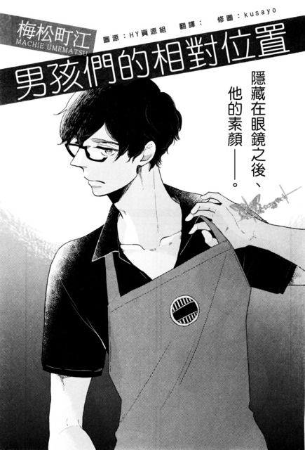 現在似乎越來越多漫畫喜歡把第一位出場的角色當作觀察用的第三者, 以往個人通常不太喜歡這種設定, 因為我總是喜歡上第一位出場的角色...想當然爾的在我發現這人根本與之後的感情線扯不上關係後會有多麼不爽(笑) 男孩們的相對位置從頭到尾便是以玉城為第一視角來進行。一開始看到故事名稱及封面椎田的圖時, 對於位置兩字我只是猜可能故事裡的攻受與猜想有所不同(笑) 也或許因為我從一開始便先入為主的自以為會是這種故事, 也因此在玉城發現真相時我也彷彿跟他一樣驚訝。看完整篇後再回頭看書名, 便覺得老師取的真是巧妙啊。
