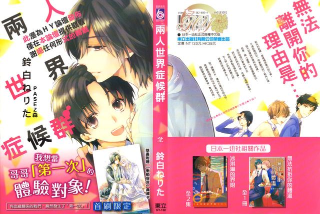 兩人世界從第一次看連載時個人就很喜歡了, 其實我一直很喜歡三P啊兄弟之類的故事(笑) 但這類的在BL裡要不是刻畫的過於心酸, 就是過於隨便。僅管兩人世界裡的兩人在一起似乎簡單到彷彿兩人間不存在亂倫及同性等問題, 但或許鈴白老師的角色與步驟很順暢, 讓人在看完後也不會特別想去吐槽那些問題。這部也因為受歡迎, 有再繼續畫後續了, 而兩人間一些比較實際的問題則在後續裡出現, 在次就先介紹本部的部份。