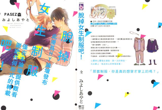 從老師的第一本單行本起, 每一本我都很愛, 卻始終沒有提筆介紹過老師。脫掉女生制服吧如果單從書名來看, 可能會誤以為是單純的女裝少年故事, 但其實故事裡涉及了人與人, 以及這社會對與自己不同群組的消極及歧視。老師更透過了朝丘與惠一這對年紀相差甚多的情侶, 來傳達兩時代在面對性向, 以及父母表現的不同。在看這本時我內心充滿著對惠一的心疼, 僅管沒有哭, 卻內心一直隱隱作疼。