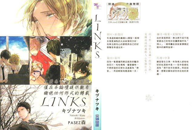 這篇與其說是秋葉與彌彥的故事, 不如說是秋葉及帶出那男人的故事。對彌彥感到抱歉的是他的對手是那個男人, 所以僅管他是現在進行式的正宮, 卻連封面都上不去(笑) LINKS裡四對的故事或許分開看都會讓人在看完後有些摸不清方向, 但其實這本要把所有故事一口氣看完後才能瞭解老師的巧思。隨著故事進行, 老師在每一話裡帶出新的角色, 以及這些角色間關係的暗示。每一話故事或許都不是那麼的完整, 但這是因為每一話都只是做為完整拼圖的一小塊, 而隨著故事進行, 當拼圖一塊塊湊齊之後, 我們才能看見那圍繞著九人之間那份完整個圓。